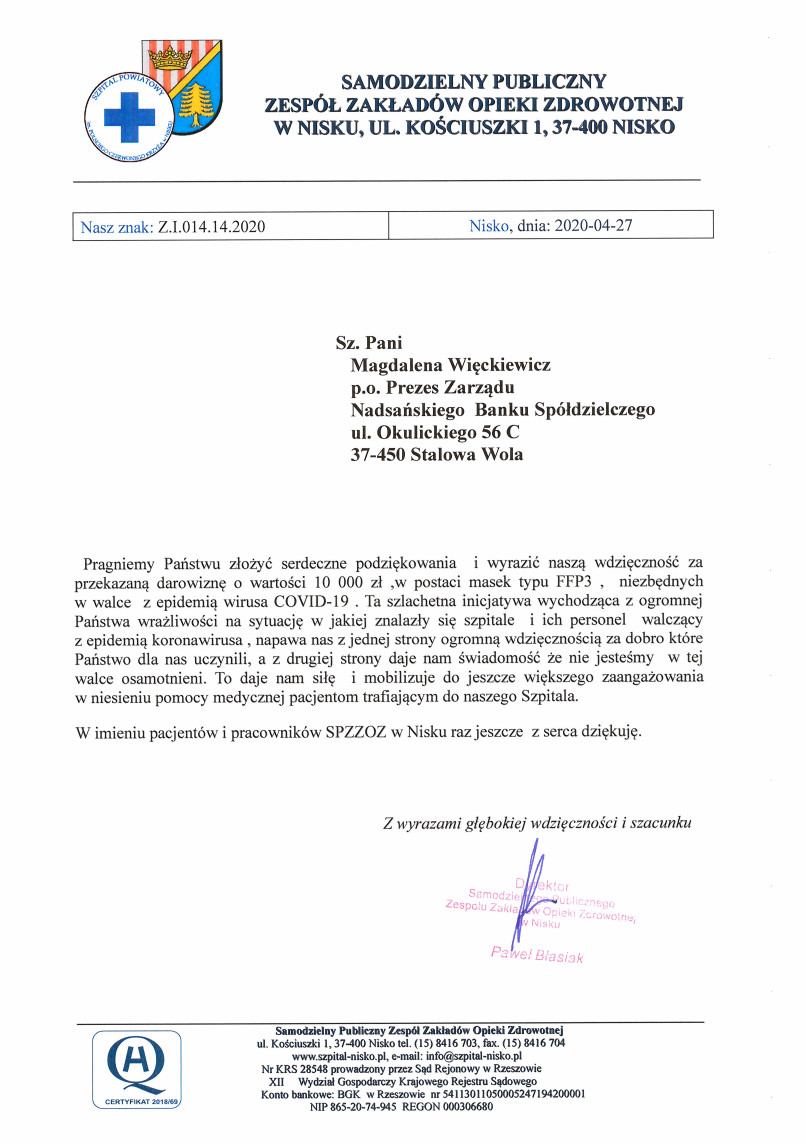 29 kwietnia 2020 :: Podziękowanie dla Nadsańskiego Banku Spółdzielczego.